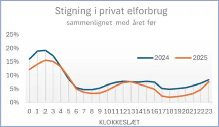 Forbruget er i 2025 steget næsten 5 procent, og forventes at lande på lidt over 39.500 GWh. Stigningen skyldes især et øget elforbrug til produktion af fjernvarme samt stigning i det private elforbrug.